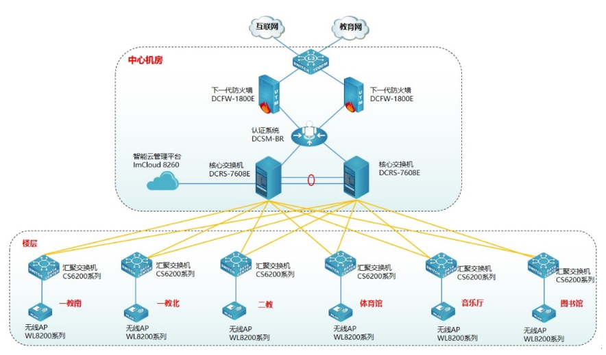 为方便用户对无线管理和维护,提升用户无线体验,使无线更智能化,此次采用DCN智能云管理平台ImCloud 8260实现无线统一的管理、维护、认证,并可实现对全网无线设备管理、实现易部署、易维护、易扩展的无线网络。DCN云管理ImCloud方案是网络服务的新模式,基于云端实现网络服务和管理,将复杂的网络管理简单化、智能化、可视化,提升用户网络体验。同时为了保证无线的安全,无线采用Portal准入认证,云管理ImCloud和DCN身份认证系统DCSM-BR实现联动,用户需要顺利获得账号和密码认证成功后才能接入无线网络,在保证无线连接的便捷性同时兼顾无线的安全性。