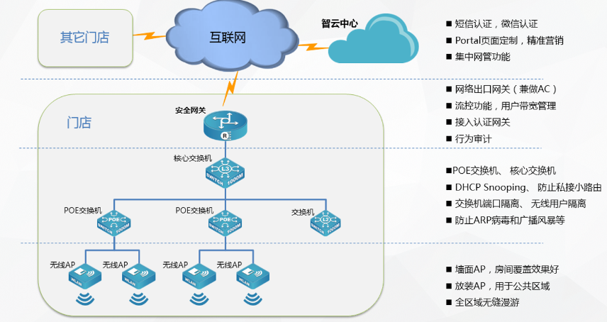 云端集中部署:AC、智云中心、网管,实现统一管理、统一策略、统一平台