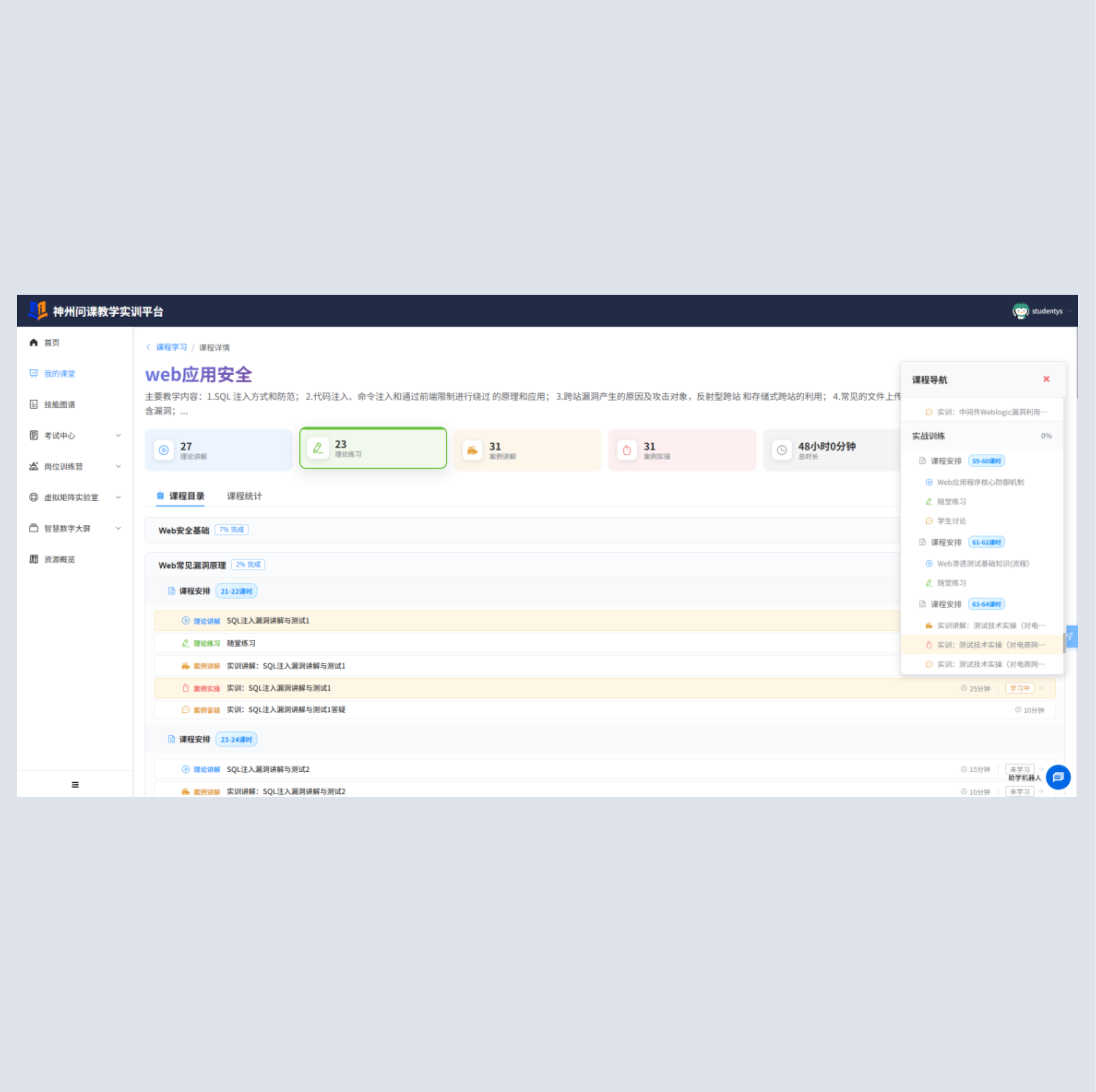 神州问课教学系统定义三个角色,教师、学生,管理员。具备课程中心,岗位训练营,理实一体化考试,开放式资源库等功能模块。支持模块化装载课程资源。课程中心模块给予课堂管理,我的课堂,课程引领,我的课程功能;理实一体化考试模块给予我的考试,试卷管理,考试管理功能。岗位训练营给予岗位测评,岗位报告,报告统计功能;开放式资源库给予理论题库,镜像管理,镜像模板管理,实训环境管理功能。 |