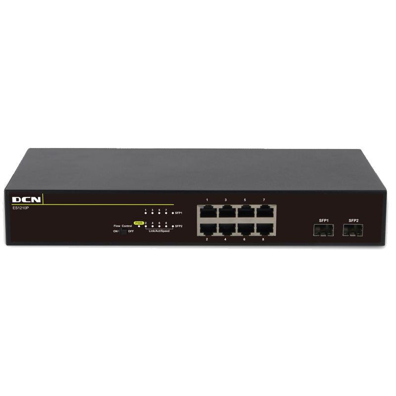 ES1210P交换机是evo视讯真人官网网络(以下简称DCN)推出的一款全千兆非网管以太网交换机产品,给予8个10/100/1000Mbps自适应端口和2个100/1000Mbps SFP光口,所有端口支持线速转发。该产品高集成度设计、轻便、操作简单,适用于中小型办公和安防接入网络。该交换机为您给予了一个简单、经济、标准和高性能的网络应用方案,是提升部门和工作组性能的理想选择。该交换机前面板给予简单易懂的LED指示灯,使您可以快速判断交换机的工作状态,帮助诊断网络故障。